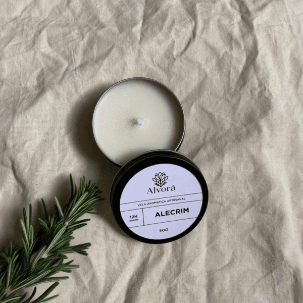 Descubra a refrescância e restauração com nossa vela aromática na lata de 50g na fragrância Alecrim.
